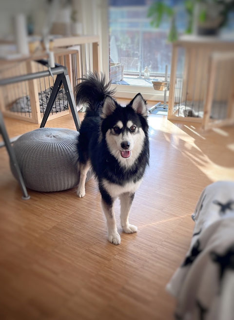"Bamboo is nu al een halfjaartje bij ons. Ondanks zijn zware rugzak is hij in al die maanden stilaan opengebloeid van een een angstig, schuw en teruggetrokken hondje tot een ware clown, een entertainer en een lieve zachte knuffelaar.